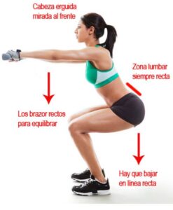 - Realiza una sentadilla completa, bajando el cuerpo hacia el suelo con las rodillas dobladas y las caderas hacia atrás.