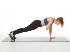 Alterna entre la posición de plancha y la posición de codo en un movimiento continuo. Este ejercicio trabaja el núcleo y los brazos. Intenta realizar entre 12 y 15 repeticiones por lado.